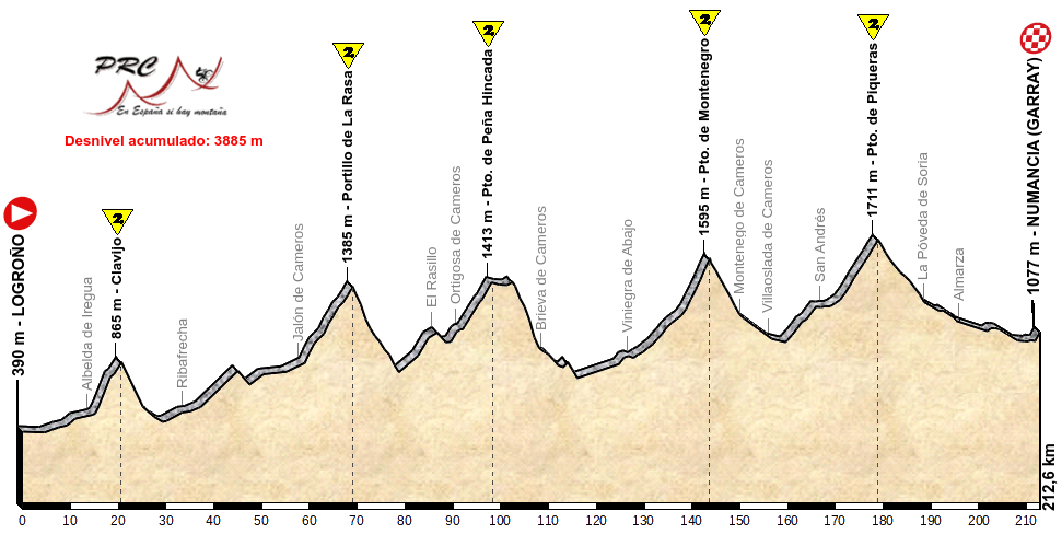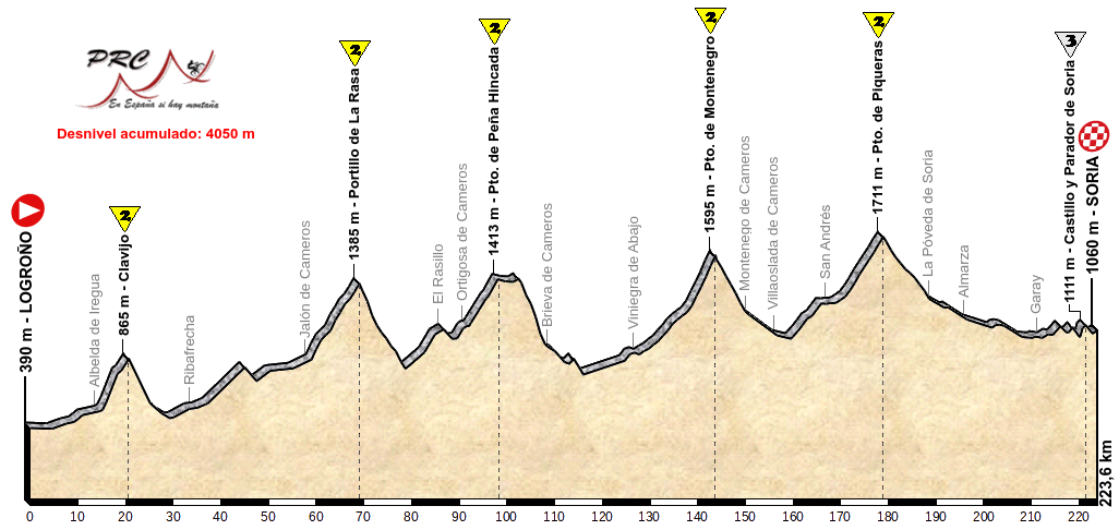 El primero de esos cuatro puertos es el Portillo de La Rasa (10 km al 5.3%), que enlaza perfectamente con la subida a Peña Hincada por su vertiente de El Rasillo (19 km al 4%), un puerto dividido en dos partes, separadas por la pequeña bajada que hay hasta el Club Náutico. A continuación es turno para el Puerto de Montenegro (primeros 14 km tendidos para rematar con 5 km al 7%), quizsá el más determinante para el desarrollo de la etapa, situado ya en su segunda mitad y con un final relativamente exigente que puede seleccionar el pelotón. El último puerto importante es el de Piqueras, en la carretera nacional que conecta Logroño con Soria, contando por tanto con perfecto asfalto y sin rampas duras. Comienza con 6 km al 3.8% hasta el Embalse de San Pajares, donde empieza el falso llano de mitad de puerto. Para coronar restan 8.4 km al 5.1%, última oportunidad de seleccionar el pelotón y buscar la escapada lejana de cara al final en Soria.