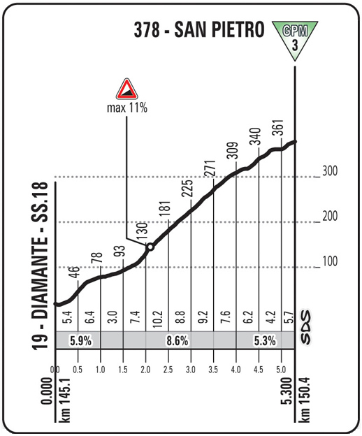 - San Pietro, 3ª (km 150,4): 378 m – 5,3 km – 6,8 %