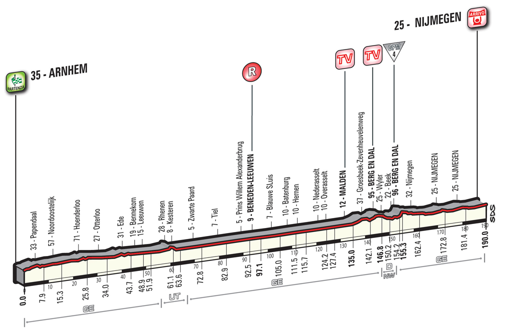 2ª ETAPA (Domingo 7 Mayo): ARNHEM – NIJMEGEN (190 km). Info oficial / Rutómetro / Plano salida – Llegada
