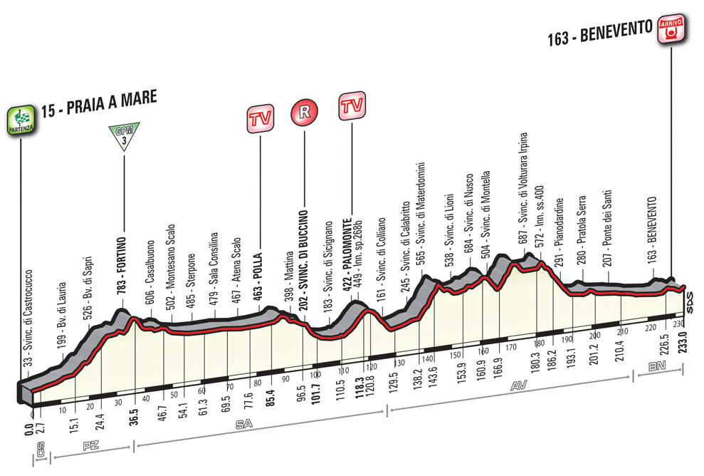 5ª ETAPA (Miércoles 11 Mayo): PRAIA A MARE – BENEVENTO (233 km). Info oficial / Rutómetro / Plano salida – Llegada