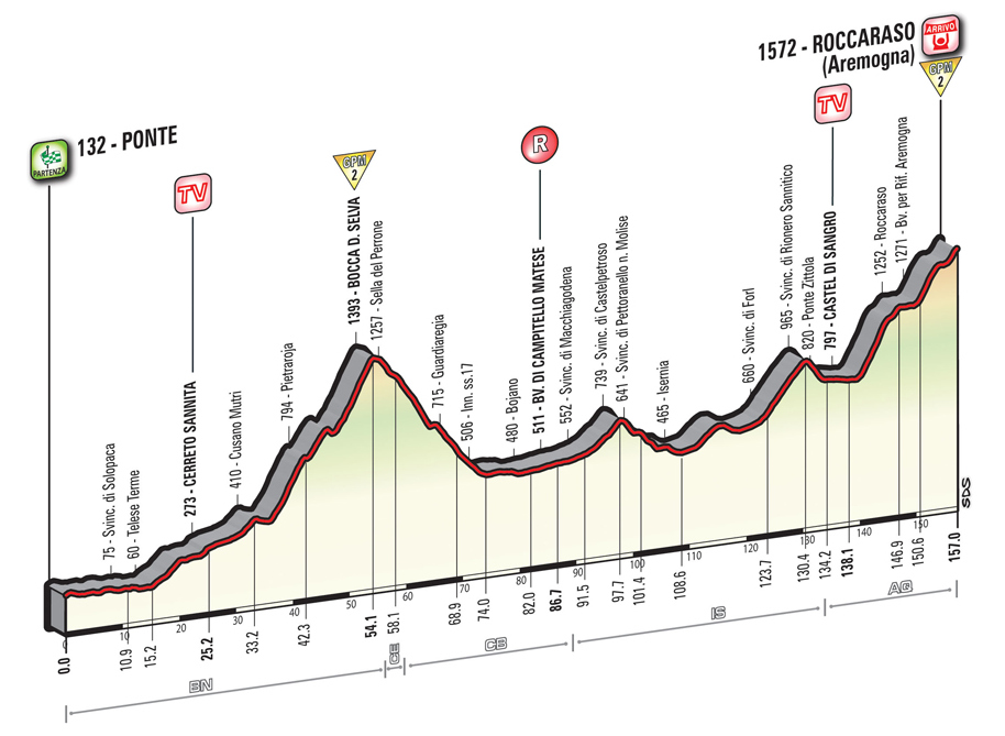 6ª ETAPA (Jueves 12 Mayo): PONTE – ROCCARASO / AREMOGNA (157 km). Info oficial / Rutómetro / Plano salida – Llegada
