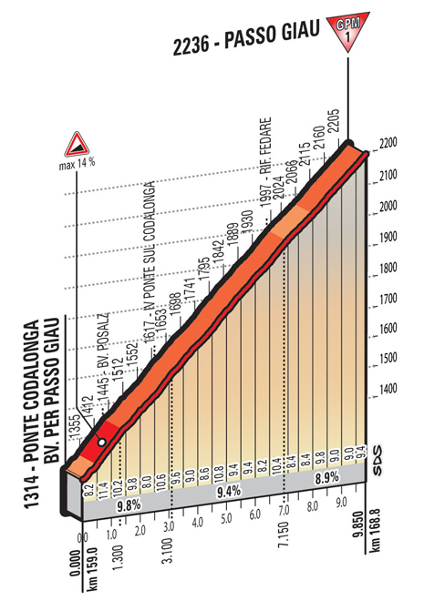 - Passo Giau, 1ª (km 168,8): 2.236 m – 9,8 km – 9,4 %