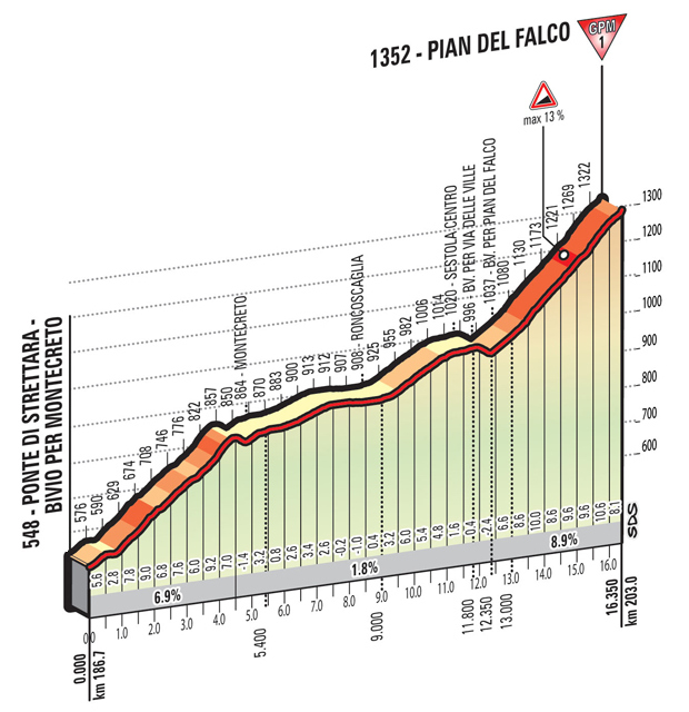 - Pian del Falco, 1ª (km 203): 1.352 m – 16,35 km – 4,9 %