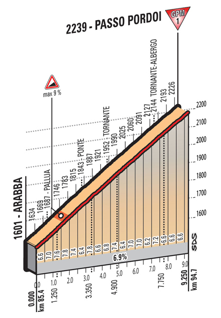 - Passo Pordoi, 1ª (km 94,7): 2.239 m – 9,25 km – 6,9 % *sin contar subida previa