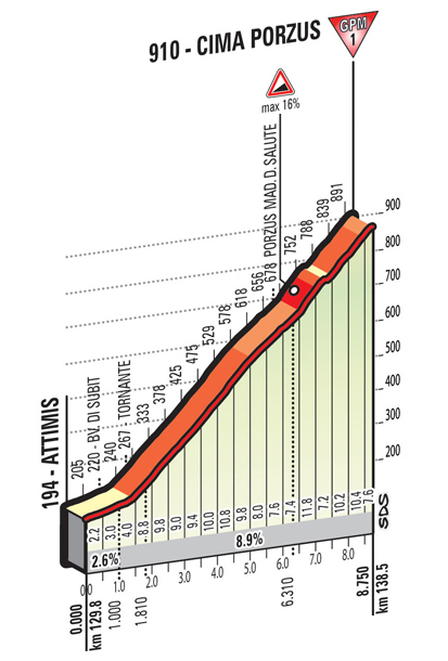 - Cima Porzus, 1ª (km 138,5): 910 m – 8,7 km – 8,2 %