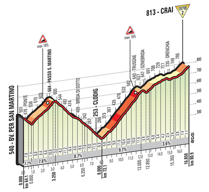 El irregular descenso de Crai llevará a los corredores a Ponte San Quirino y un primer paso por meta, con unos 30 km llanos antes de afrontar Porzus, con cifras de 7,4 km al 9,2% (sin el falso llano inicial) y descenso muy complicado, por una vía estrecha y muy revirada; y justo a continuación el puerto de Valle, más modesto que Porzus pero aún así con 5,3 km finales al 8,5% de media. Una vez coronado, a 14 km a meta, nueva bajada por una carretera muy estrecha hasta llegar a Campeglio, restando 7 km llanos hasta meta.