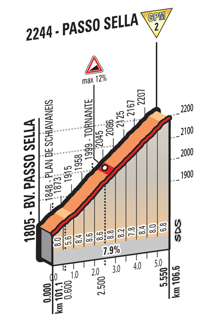 - Passo di Sella, 2ª (km 106,6): 2.244 m – 5,55 km – 7,9 %
