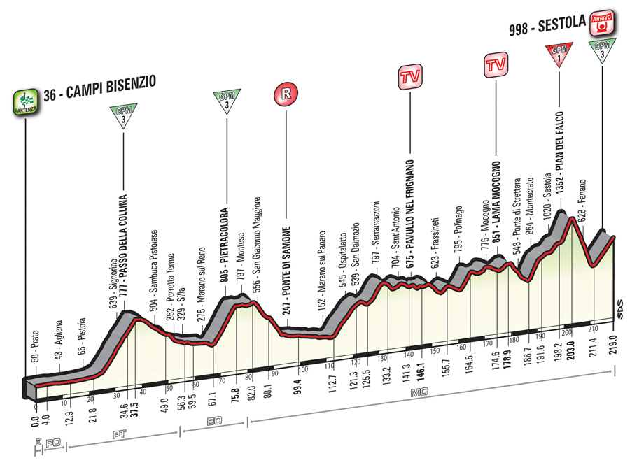 Después de la jornada de descanso, sin casi traslado desde Chianti, la carrera se reanuda con una larga etapa de media montaña entre las localidades de Campi Bisenzio y Sestola, en la provincia de Modena, teniendo que superar de inicio dos puertos de 2ª (aunque catalogados de 3ª), Passo della Collina y Pietracolora, antes de una zona llana previa al ascenso a Serramazzoni (no puntuado), que dará paso a una zona muy «pestosa», con 50 km de sube y baja constante.