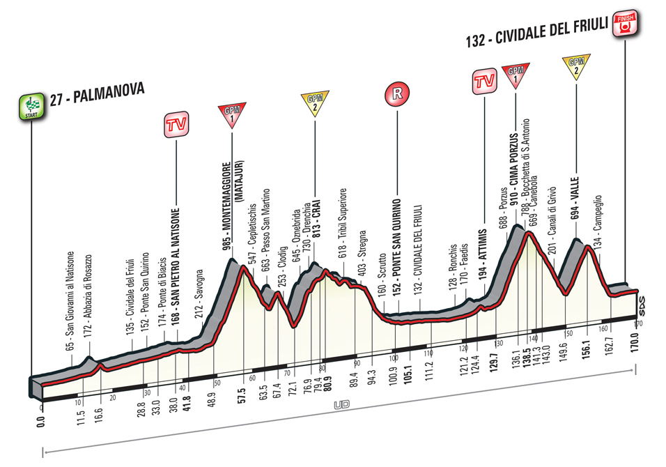 El tríptico montañoso del fin de semana se inicia con una novedosa etapa entre Palmanova y Cividale del Friuli, en la provincia de Udine, junto a la frontera con Eslovenia, atravesando los Alpes Julianos con hasta 4 puertos inéditos (5 si se cuenta San Martino), ninguno de ellos superando los 1000 m de altitud pero por carreteras secundarias y con bastante dureza, llegando a rozar la categoría Especial en los casos de Montemaggiore y Cima Porzus.