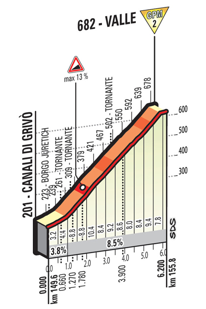 - Valle di Campeglio, 2ª (km 156,1): 682 m – 6,2 km – 7,6 %