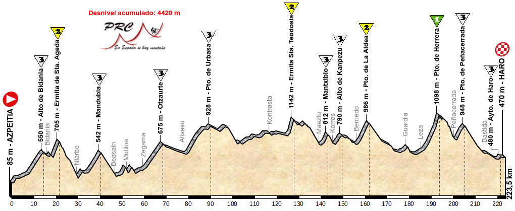 Continuamos hacia San Vicente de Arana, donde vuelven de nuevo las hostilidades al subir Teodosia, el típico muro vasco de 2,7 km al 9,1% y rampas de hasta el 17%. Su descenso se hace a través del Puerto de Iturrieta. Dos pequeños puertos (Mantxibio y Kampezu) nos permiten encadenar Teodosia con La Aldea (4,6 km al 6,6%). Su bajada da paso a un terreno de repechos previo a la subida más dura del día, Herrera, que con el desgaste previo se hará duro. Al estar lejos de meta, los favoritos que quieran atacar, lo han de hacer con decisión, para sacar una ventaja que puedan mantener en el descenso, en la corta subida a Peñacerrada (4,1 km al 5%) y luego en la larga bajada hasta Haro.