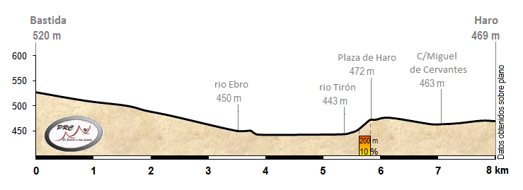Con su casco antiguo situado en los cerros de Santo Tomás y Santa Lucía, Haro es un magnífico mirador sobre el río Ebro, y a su vez permite diseñar en sus calles un «final trampa» con un corto repecho desde el río hasta la Plaza de la Paz, centro neurálgico de la ciudad donde se encuentran el Ayuntamiento, la puerta de San Bernardo y el Palacio de Bendaña. Cuenta con 200 metros al 10% que terminan al cruzar el arco bajo el Ayuntamiento y comenzar una mínima bajada que, sin mucha complicación, deja a los corredores en la meta tras apenas 2 km. En definitiva, un final pintoresco y con aliciente para terminar de decidir unas etapas que deberían venir ya seleccionadas por el terreno anterior, ya que el repecho no tiene entidad suficiente como para bloquear la carrera esperando a él.