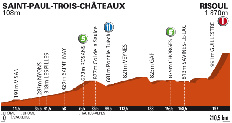 Una vez coronado, en la frontera entre Italia y Francia, largo descenso antes de un tramo de más de 20 km de falso llano favorable hasta llegar a Guillestre, donde comenzará la subida a la estación de esquí de Risoul, con unas cifras de casi 13 km al 6,9% de media y destacando el último tramo, con 3,8 km al 8,5% antes de meta, siendo el final en alto más duro de esta edición, aunque de todos modos no pasa de ser un 1ª. En cualquier caso, su efecto dependerá de la batalla previa, pudiendo hacer mucho daño si la carrera se rompe en el Agnello, o resultar decepcionante si los favoritos lo dejan todo para la subida final.