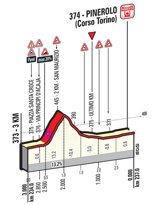 En cuanto a los antecedentes, el estreno de Pinerolo tuvo lugar en la etapa reina de la mítica edición de 1949, con 250 km y los puertos de Maddalena, Vars, Izoard, Montgenevre y Sestriere, una jornada en la que Coppi se convirtió en leyenda tras atacar en el primer puerto y llegar a Pinerolo con 12 minutos de ventaja sobre Bartali. Ese mismo recorrido, que se repitió en 1982 aunque sin diferencias entre los favoritos, se programó de nuevo para 2009, pero al final se cambió el trazado, incluyendo Moncenisio, con 5,6 km finales al 10%, Sestriere desde Susa y Pramartino oeste (por donde se bajará este año), consiguiendo la victoria Di Luca, con Pelizzotti 2º, aunque actualmente figura como ganador Menchov debido al positivo de los 2 primeros.