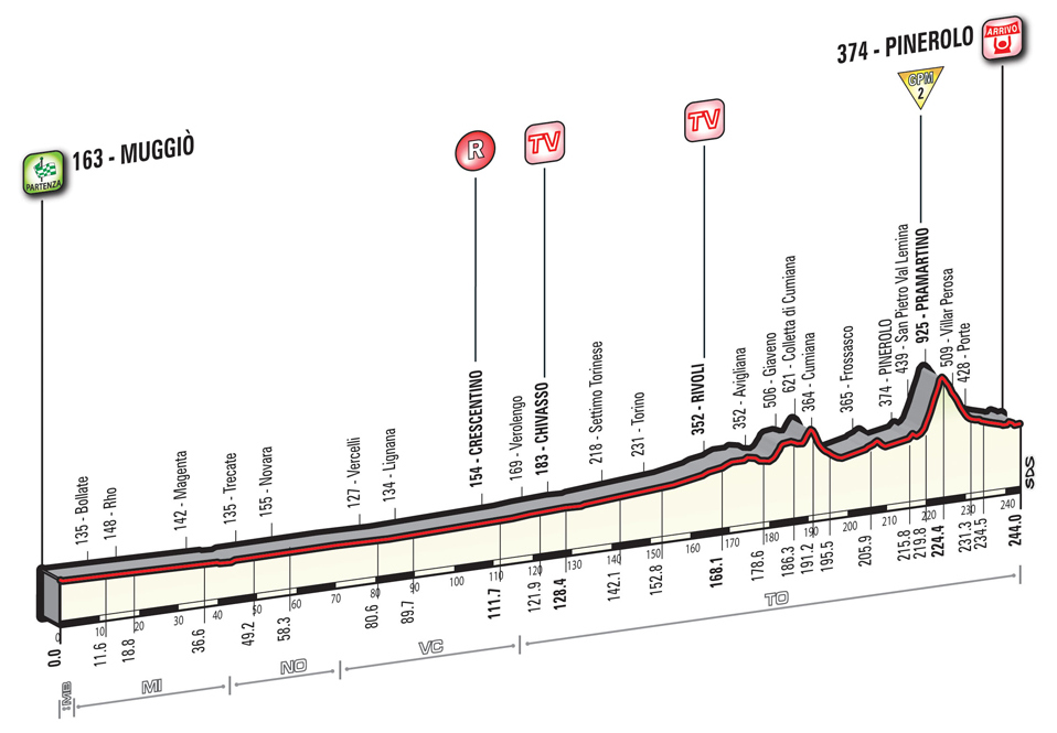 18ª ETAPA (Jueves 26 Mayo): MUGGIO – PINEROLO (240 km). Info oficial / Rutómetro / Plano salida – Llegada