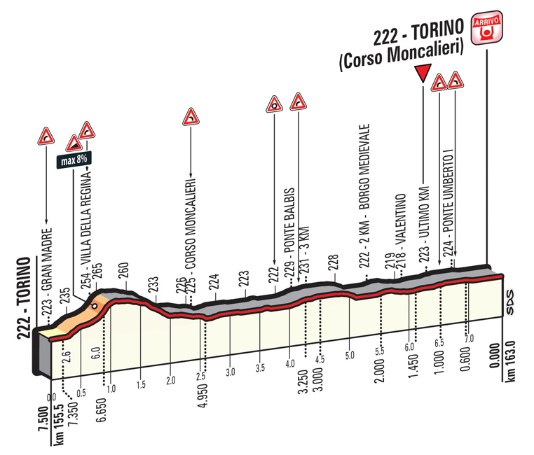 Respecto a las llegadas previas en Turín, si bien es uno de los finales de etapa más habituales en el Giro, con 40 llegadas, será sólo la 2ª ocasión en que albergue el final de la prueba, con el único antecedente de 1982: una crono de 42,5 km en la que se impuso Hinault, rematando su 2º Giro tras el logrado en 1980, completando luego el triplete en 1985.