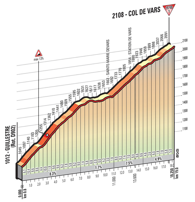 - Col de Vars, 1ª (km 19): 2.108 m – 18,3 km – 6 %