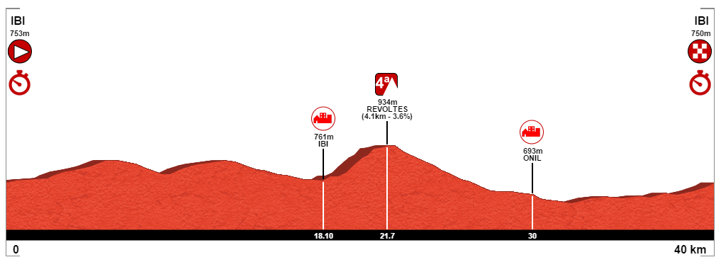 Una vez coronado,a unos 20 km de meta, tendido descenso en dirección a Onil, localidad donde la ruta girará hacia el sur y posteriormente al oeste en busca de la llegada en Ibi, con los últimos km picando hacia arriba. En definitiva, un recorrido exigente y donde será clave saber regular, ya que quién se exprima en la 1ª mitad de la ruta puede acabar pagándolo en el último tramo, favoreciendo en cualquier casoa los rodadores completos.