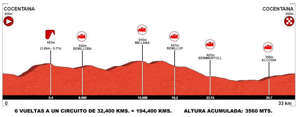 Terminado el descenso hay un pequeño llano, con paso por L´Alqueria d´Asnar, antes del repecho de Alcudia, con casi 2 km de subida aunque sólo el primero, rondando el 5%, tiene algo de dureza. Superada esa pequeña cota ya sólo restará la travesía por Cocentaina, con la llegada situada en el Passeig del Comtat, con los últimos 500 m sobre baldosa y picando ligeramente hacia arriba -> recta de meta. En definitiva, un recorrido exigente, atravesando un terreno «rompepiernas» y de bastante desgaste, como lo certifican los alrededor de 3600 m de desnivel acumulado, pero poco rompedor, al no incluir grandas subidas y circular por carreteras en perfecto estado, por lo que dependerá mucho del ritmo y la actitud de los corredores para hacer daño.