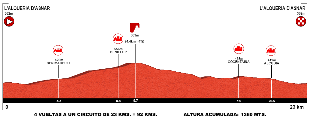 El inicio es básicamente llano, incluso con tendencia favorable, pero una vez que la ruta gire hacia el este y se deje atrás Benámer, cruzando el puente sobre el río Serpis, comenzará la subida a Benillup, primero de un modo muy tendido, con paso por Benimarfull, pero ganando algo de pendiente tras el desvío hacia el sur, con 5 km finales al 4%. El descenso, también suave, temina en el puente sobre el río Valleseta, dando paso a una zona de falsos llanos, en general con tendencia favorable, aunque con un pequeño repecho en Cocentaina, en busca de la línea de meta en L´Alqueria, que pica hacia arriba.