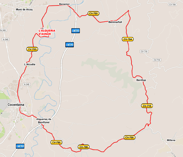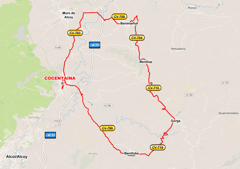 La parte inicial, dejando atrás Cocentaina, es de suave descenso, pero al cruzar el puente sobre el río Serpis la carretera empieza a picar hacia arriba, con algo más de 3 km de subida hasta el Alto de La Venta, si bien sólo los 2 km finales tienen cierta entidad, rondando el 5%. Una vez coronado no hay bajada, entrando en una zona de falsos llanos, con paso incluído por Benilloba, hasta el cruce con la CV-710, con un corto descenso antes de afrontar la 2ª subida del circuito: el Alto de Millena, con 3,4 km al 4%, incluyendo 2 tramos al 5-6% aunque el descansillo a la altura de Gorga baja la media. Después de coronar hay una pequeña bajada antes del repecho de Benillup, previo a esta localidad y que dará paso a una larga bajada, con 8 km al 3,5% hasta un nuevo puente sobre el río Serpis, no teniendo complicaciones mas allá del estrechamiento en Benimarfull.