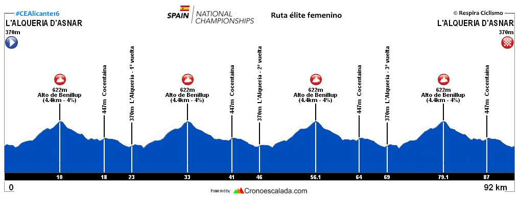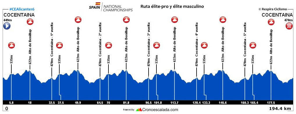 Entre el jueves 23 y el sabádo 25 de junio se celebra una nueva edición de los Campeonatos de España de Ciclismo en Carretera, en esta ocasión en la provincia de Alicante, en la Comunidad Valenciana, con la prueba estrella, la carrera en línea Élite-UCI masculina, disputándose el próximo sábado (un día antes de lo habitual debido a las elecciones) en torno a la localidad de Cocentaina, con los corredores teniendo que dar 6 vueltas a un circuito de 32,4 km, para un total de casi 195 km, contando con la mejor participación de los últimos años.
