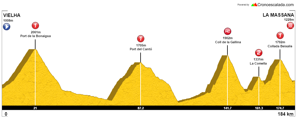 - Port de la Bonaigua, 1ª (km 19): 2.072 m – 13,7 km – 6,1 % *sin contar falso llano
