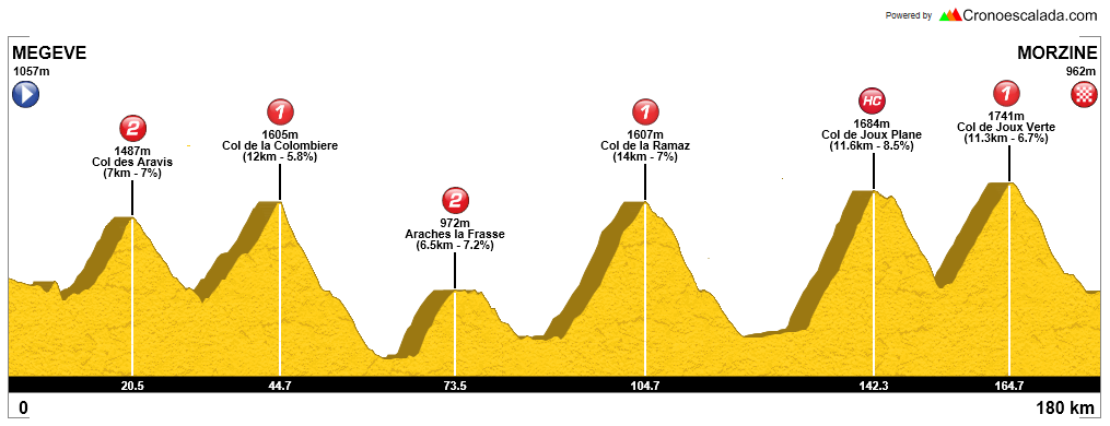 Como última oportunidad para ver cambios en la general, nueva etapa de montaña en la Alta Saboya, con el Col de Aravis, 7 km al 7% de media, y el Col de la Colombiere, con 12 km a casi el 6% de media, en el primer tercio de la etapa, para tras una zona llana afrontar el Col de la Ramaz, un buen 1ª con 14 km al 7%, incluyendo 2,5 km centrales al 10%, aunque su paso ha estado en duda debido a desprendimientos (de hecho se ha excluído de la «Etape du Tour«), y el Joux Plane, que con 11,6 km al 8,5%, rondando el 9-10% en los últimos 6 km, puede destrozar el grupo a poco que el ritmo sea elevado, restando desde la cima 12 km a meta, con el traicionero repecho de Ranfolly (800 m al 4%) antes de un peligroso descenso hacia la localidad de Morzine, con la llegada picando hacia arriba.