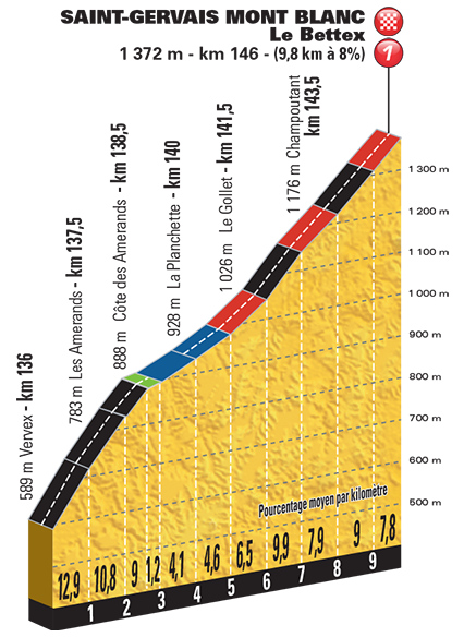 El irregular descenso de Bisanne, con paso incluído por Saisies, llevará a los corredores hasta el falso llano de Megéve, retomando después el descenso en busca de Le Bettex por Amerands, con un muro inicial de 2,5 km al 10,5% antes de una zona central más tendida, volviendo la dureza en el tramo final, con 4 km al 8,6%, para un total de 10 km al 8% de media, pudiendo hacer mucho daño si se sube a tope desde el inicio, sobre todo si ha habido ya batalla en Bisanne, aunque la distancia entre puertos y la dureza de Amerands no ayudan a los ataques lejanos, pudiendo quedar la pelea entre los favoritos reducida a la subida final.