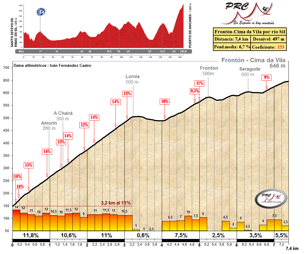 • Cota de Pombar, np (km 160):  710 m – 2,2 km – 7,5 %