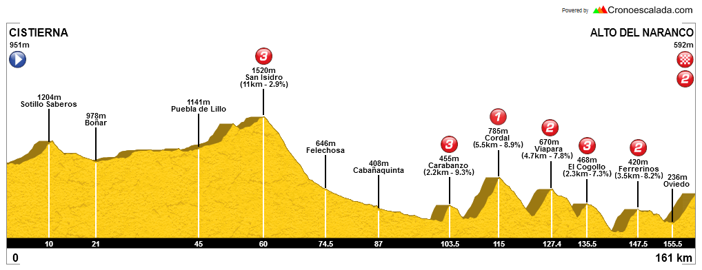 9ª ETAPA (Domingo 28 de agosto):  CISTIERNA – OVIEDO / ALTO DEL NARANCO  (164,5 km).  Info oficial