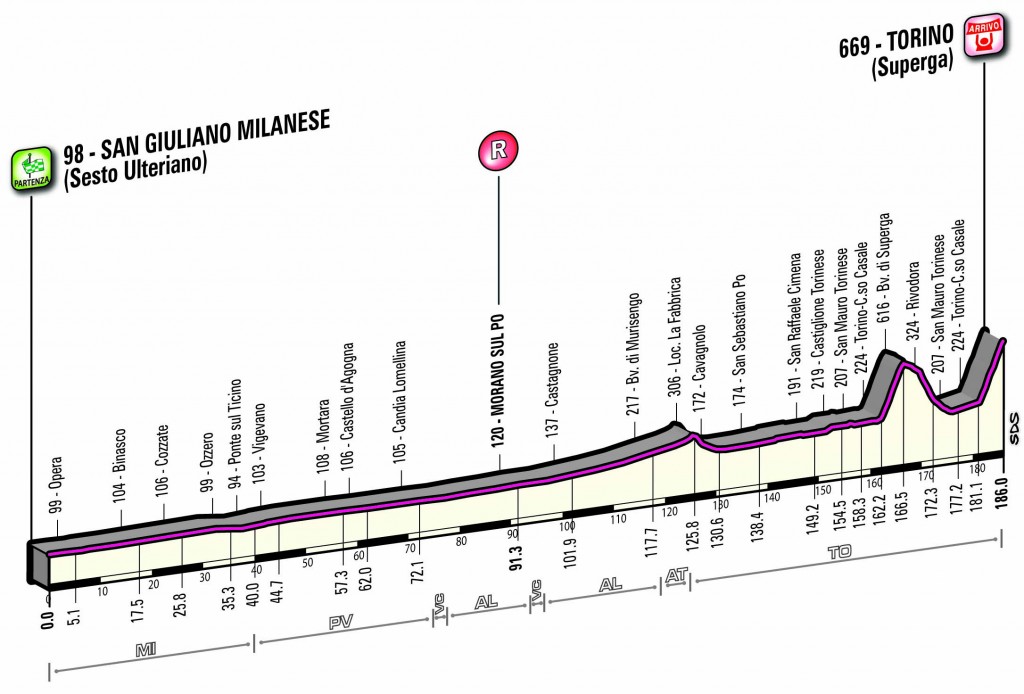 Así pues, la carrera partirá desde la localidad de Sesto Ulteriano, población de unos 3.500 habitantes perteneciente al municipio de San Giuliano Milanese, en las cercanías de la capital lombarda, dirigiéndose hacia el oeste por la llanura del Po y atravesando durante la ruta las provincias de Milan, Pavia, Vercelli, Alessandria y Asti antes de la entrada en Turín, estas cuatro últimas dentro ya de la región del Piamonte, en el extremo oeste del país.