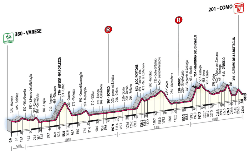 Como decíamos al inicio, el trazado de este año sigue la dirección inversa al de de 2015, uniendo las localidades de Como y Bergamo mediante un duro trazado de 241 km, que si bien es algo más corto de lo habitual, con casi 20 menos que el de 2014, el último que tuvo la llegada en Bergamo, tiene una mayor exigencia en los puertos, incluyendo un HC y varias Primeras, que además se concentran principalmente en la 2ª mitad de la ruta, con un estupendo encadenado de 5 puertos antes de un tramo llano previo a la última cota, a solo 3 km de meta.