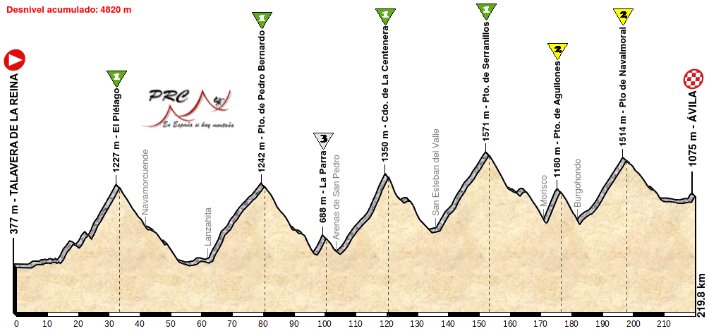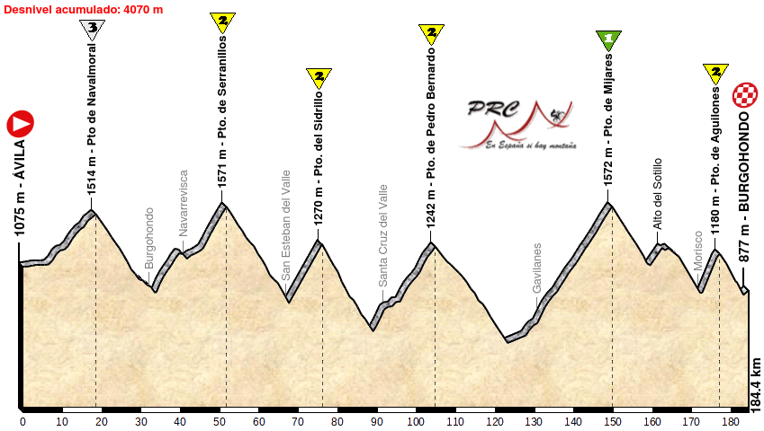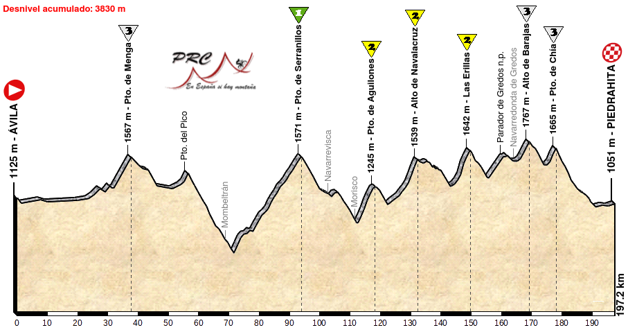 Con salida de Ávila, otra etapa sin un metro de llano de continuo sube y baja de puertos. Ya de inicio se suben tanto Navalmoral (11 km al 3.9%) como Serranillos (18.2 km al 4%) por sus caras más suaves. Tras el descenso de éste se sube por El Sidrillo (9 km al 5.7) para conectar con la carretera del puerto del Pico, y bajar para cerrar el bucle subiendo el Puerto de Pedro Bernardo (16 km al 4.5%). Se completan así los primeros 100 km de etapa, terreno perfecto para las escapadas y de mucho desgaste de cara al enlazado final de puertos donde se deberán jugar las cosas importantes.