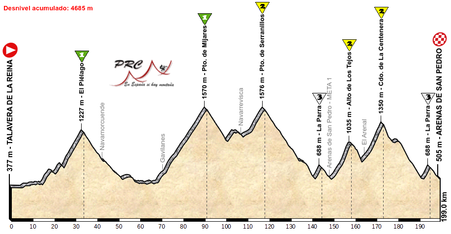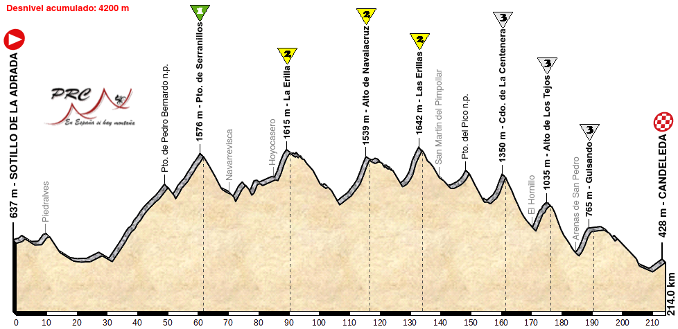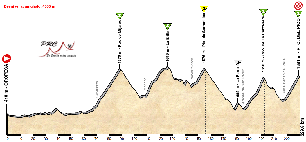 Cuarto y último final en alto. Y siguiendo la tónica de la entrada, con otro encadenado fantástico en los últimos 50 km. Destaca la etapa por sus 4 puertos de Primera, y porque desaparece el llano una vez se comienza a subir al Puerto de Mijares (22.2 km al 4.9%). Tras este se baja a Morisco, subiendo así por Aguilones como en otras etapas… pero en este caso continuando por Navaquesera hasta coronar La Erilla (17.6 km al 4.6% y un duro inicio). Se baja entonces por Hoyocasero y su pinar, para afrontar Serranillos (6 km al 5.9%) por el norte y, tras una larga bajada y el repecho de La Parra (2.9 km al 6.1%), llegar a Arenas de San Pedro.