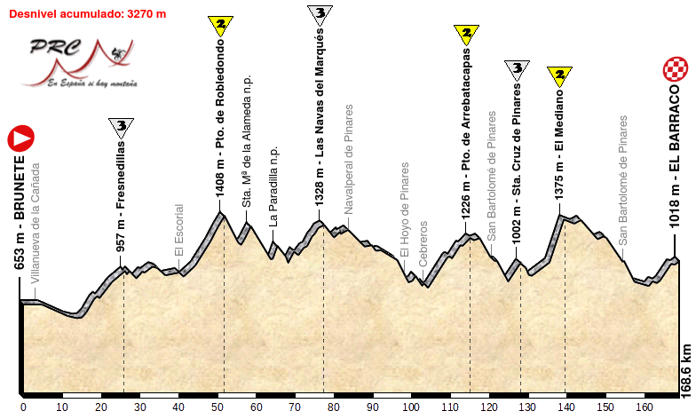 Antes del juez de la etapa, aparece la trampa de Santa Cruz de Pinares tras un descenso por San Bartolomé que se repetirá posteriormente para cerrar el bucle. El puerto de El Mediano es sin duda el más exigente de todos, con 4 km al 9.2% y máximas del 17%. Su cima se encuentra a 29 km del final, que se reparten primero en una bajada sencilla y con falsos llanos a la que sigue un descenso más pronunciado y técnico por San Bartolomé. Tras concluir este, ya solo queda la suave ascensión final hacia El Barraco para rematar la etapa. En definitiva, buena media montaña, muy quebrada, con carreteras «muy ciclistas» y un puerto rompedor antes de un final especial como es El Barraco.