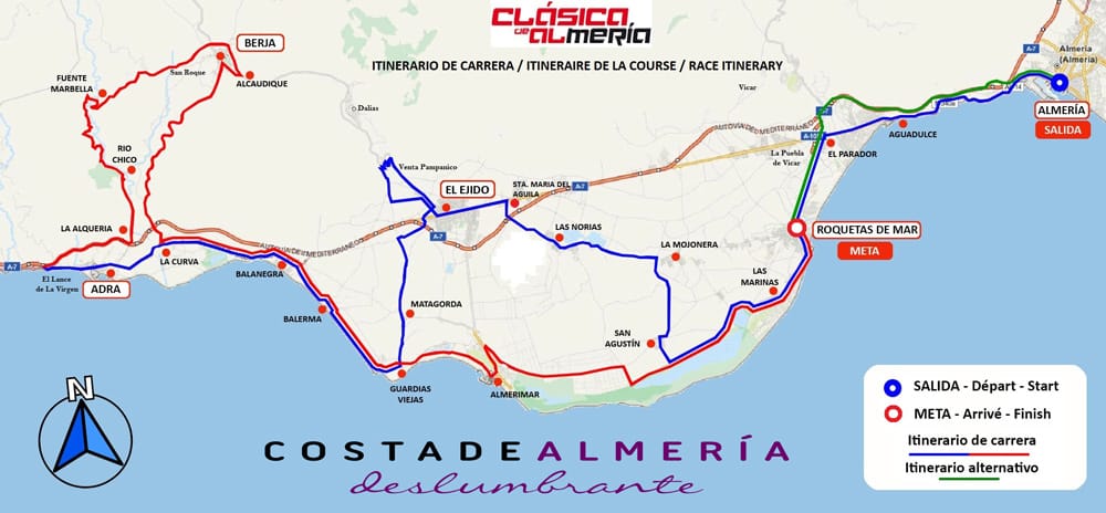 Este domingo 12 de febrero, en vísperas de la Vuelta a Andalucía, se celebra la 32ª edición de la Clásica de Almería, carrera de la categoría 1.1 del circuito europeo de la UCI (tras haber perdido la categoría 1.HC en 2014) y que este año cuenta con un recorrido casi idéntico al que estaba programado en 2016, con llegada Roquetas de Mar, cuando el fuerte viento impidió que se circulara por la ruta prevista, dando en su lugar 7 vueltas a un pequeño circuito final.
