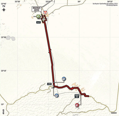 1ª Etapa (Jueves 23 febrero): MADINAT ZAYET – MADINAT ZAYET, «EMIRATES MOTOR COMPANY» (189 km). Rutómetro (Zip)