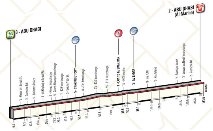 2ª Etapa (Viernes 24 febrero): ABU DHABI – ABU DHABI, «NATION TOWERS STAGE» (153 km). Rutómetro (Zip)