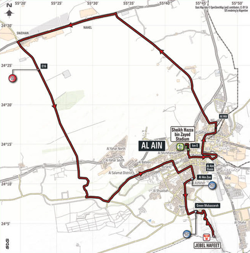 Así pues, la carrera comenzará con una etapa de 190 km con salida y llegada en la localidad de Madinat Zayed, al oeste del país, con un trazado de ida y vuelta atravesando el desierto. En la 2ª etapa, ya en Abu Dhabi, realizarán varios bucles en torno a la ciudad hasta completar algo más de 150 km, de nuevo con un trazado llano y favorable para los velocistas. En la 3ª jornada será el turno para la etapa reina, con la dura subida a Jebel Hafeet, una subida con casi 11 km al 6,6%, si bien esta pendiente es engañosa, subiendo al 8% de media si se cuentan sólo los 7 km centrales, con largos tramos al 9-10%, para ya en la última parte suavizar bastante, teniendo incluso un corto descenso a medio km de meta. Y como despedida de la prueba, etapa nocturna en el circuito de Yas Marina, conocido por las carreras de Formula 1 y al que en esta ocasión los ciclistas tendrán que dar 26 vueltas, completando 143 km hasta un más que probable sprint masivo.
