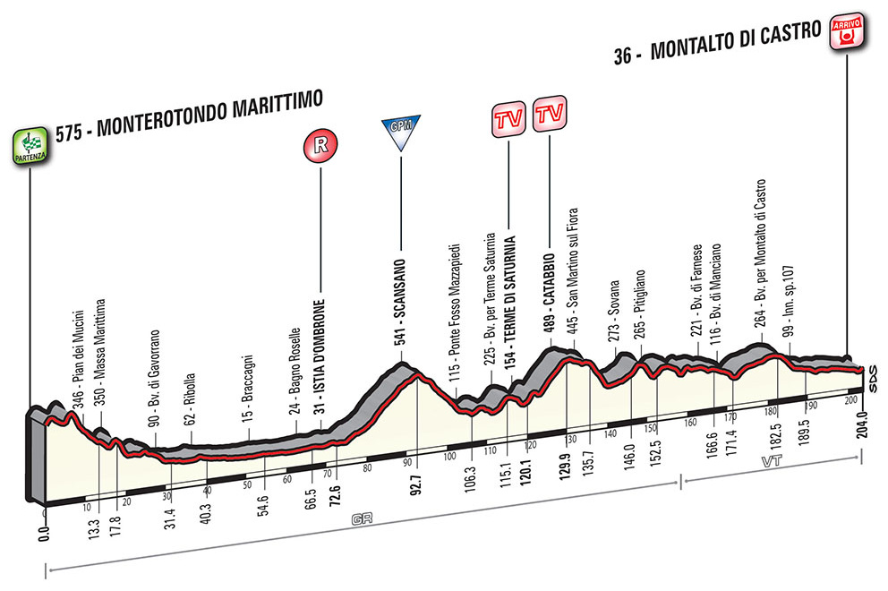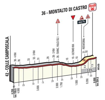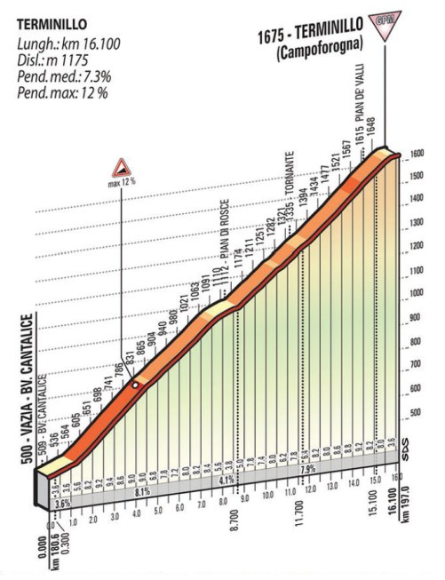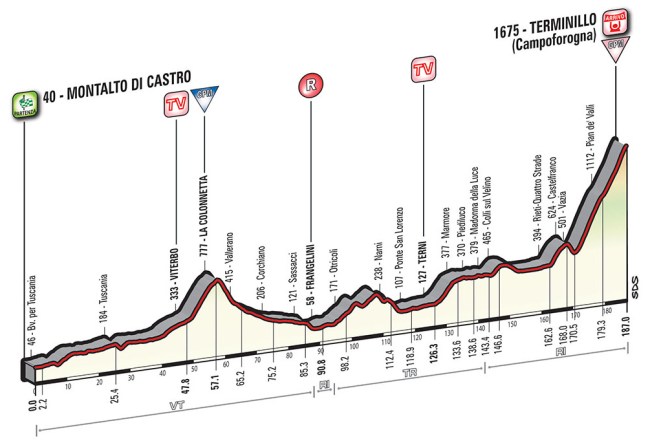 La jornada siguiente, con llegada en Montalto di Castro, también supera los 200 km, con un recorrido que si bien es muy «pestoso» en su parte central, con múltiples repechos y los puertos de Scansano y Cattabio (no puntuado), no parece selectivo como para evitar el sprint, con 30 km finales básicamente llanos … aunque eso sí, ojo al último km, con un pequeño repecho a sólo 400 m de la llegada, que pica hacia arriba, siendo el mismo final en el que se impuso Gaviria en 2016. En la 4ª etapa, turno para la jornada reina, con casi 190 km y llegada en estación de esquí de Campoforogna, en el Monte Terminillo (Sella di Leonessa), una subida sin grandes rampas pero constante al 8% (a excepción de un descansillo central), para unas cifras totales de 16,1 km al 7,3% de media. Anteriormente los corredores tendrán que superar La Colonnetta, con algún tramo exigente, Marmore y Castelfranco, justo antes de la subida final. El Terminillo es un ascenso mítico del Giro, siendo el final en alto más repetido en la historia de la prueba, con 9 llegadas, aunque el último antecedente tuvo lugar en la Tirreno Adriático 2015, con el triunfo de Quintana bajo la nieve.