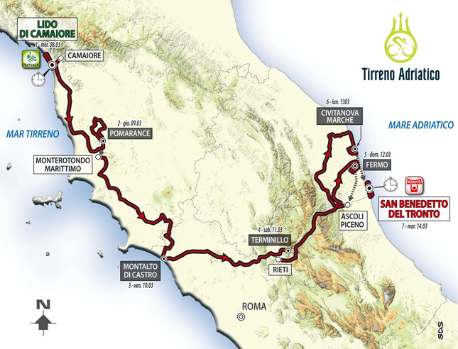 Del 8 al 14 de marzo, coincidiendo con la París-Niza, se disputa la 52ª edición de la Tirreno Adriático, la segunda prueba por etapas más importante de todas las que se celebran en el país transalpino, sólo superada por el propio Giro de Italia, y una de las carreras de una semana con mayor relevancia y prestigio de toda la temporada.