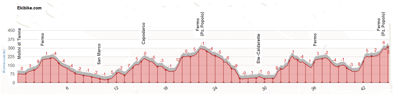 Los últimos 45 km, con las múltiples cotas en torno a Fermo (algunos % son engañosamente bajos, al quedar la subida «partida» entre dos km)