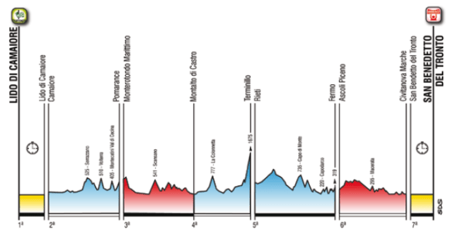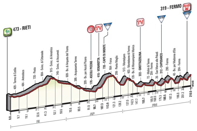 5ª ETAPA (Domingo 12 Marzo): RIETI – FERMO (209 km). Rutómetro / Salida – Llegada