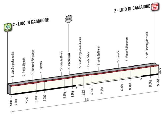 1ª ETAPA (Miércoles 8 Marzo): LIDO DI CAMAIORE – LIDO DI CAMAIORE (CRE) (22,7 km). Rutómetro / Salida y llegada / Últimos km