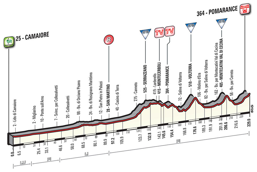 2ª ETAPA (Jueves 9 Marzo): CAMAIORE – POMARANCE (229 km). Rutómetro / Salida – Llegada