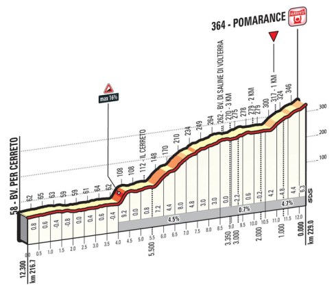 - Montecatini Val di Cecina (km 206,6): 405 m – 3,4 km – 6,2 %