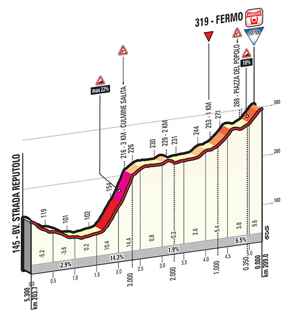 Los 5 km finales, con Fermo por Reputolo (800 m al 14%), que se subirá 2 veces. *Los 350 m antes de meta sólo en último paso