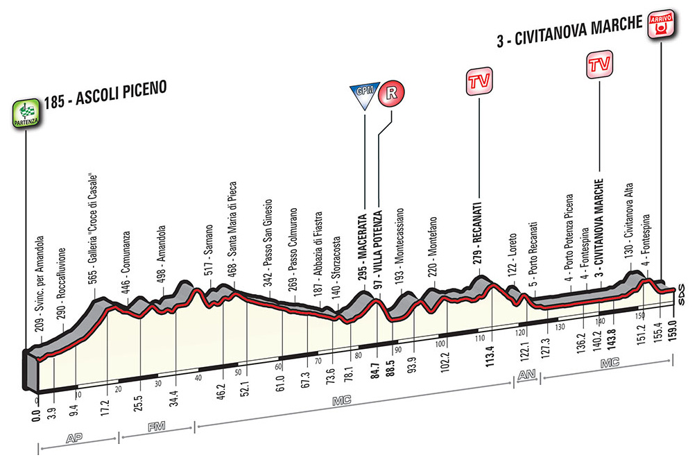 6ª ETAPA (Lunes 13 Marzo): ASCOLI PICENO – CIVITANOVA MARCHE (159km). Rutómetro / Salida – Llegada