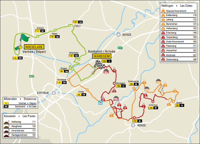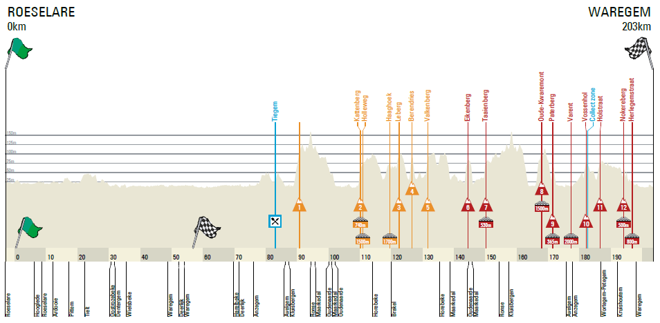 El trazado de la prueba, con salida desde la localidad de Roeselare y llegada en Waregem, al oeste de Bélgica, se ha mantenido muy estable en los últimos años, con un tercio inicial sin dificultades reseñables, incluyendo un primer paso por Waregem, antes de afrontar un largo bucle al sureste de esta localidad que contiene a su vez otros bucles más pequeños (formando una especie de 8), y donde al igual que en las demás clásicas flamencas destacan las múltiples cotas, en algunos casos con fuertes rampas, varias de ellas adoquinadas, destacando los muros de Eikenberg, Taaienberg, Oude Kwaremont y Paterberg, aunque lejos de meta, restando después dos cotas asfaltadas y el tendido Nokereberg. También hay varios tramos de pavé llanos, si bien en mejor estado que los de la París-Roubaix.
